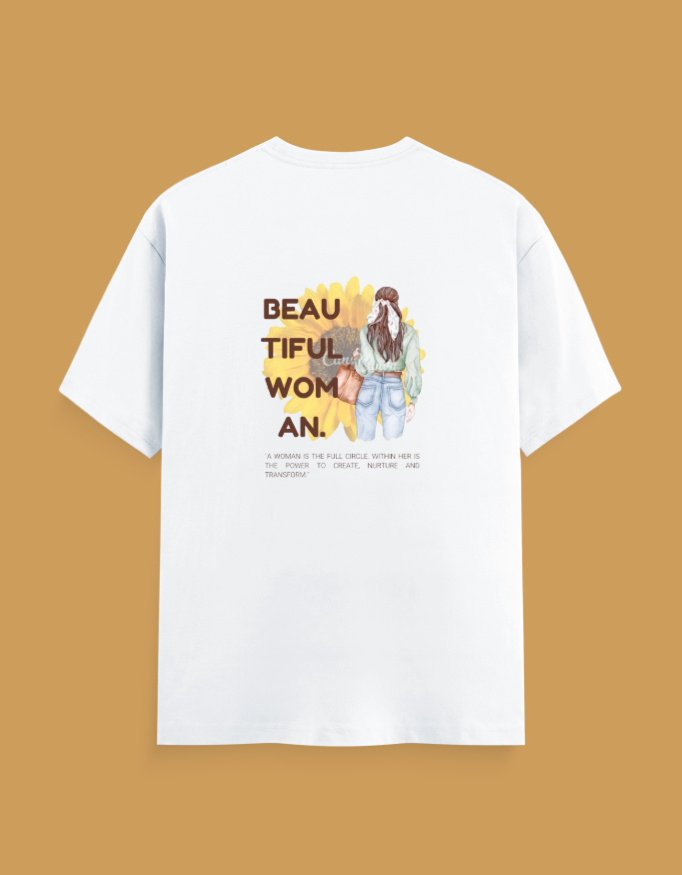 Featuring a graceful illustrated female figure set against a warm sunflower backdrop, this design symbolizes growth, positivity, and resilience. The bold yet elegant typography spelling “BEAUTIFUL WOMAN” reinforces a message every woman deserves to hear and believe. Below, the empowering line reminds us that a woman holds the power to create, nurture, and transform — within herself and the world around her.